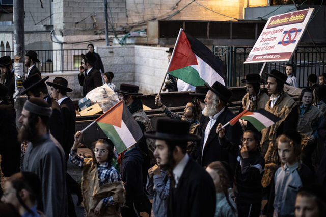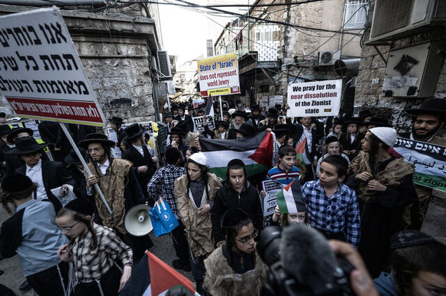 Grup, Filistin bayrakları ve "Yahudiler 76 yıldır (İsrail'in kuruluşundan itibaren) utanç yaşıyor", "Siyonizm Yahudilik değildir", "Asıl hahamlar hep Siyonizm'e karşı çıktı", "İsrail ordusu Yahudileri değil Siyonistleri koruyor" yazılı dövizler taşıdı.