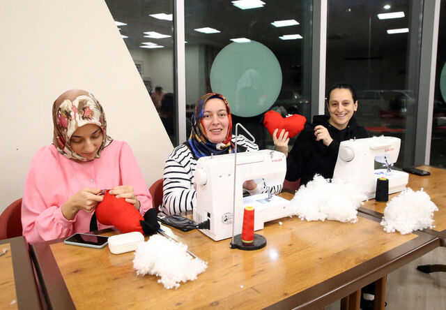 Özel gereksinimli çocuklarıyla Mutlu Kafe'ye gelen anneler, dikiş makinelerinin başına geçerek kalp şeklinde üzerinde, "Sevgiyle el ele" yazan yastıklar yapmaya başladı.