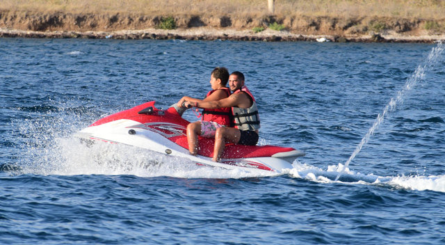 1 hafta burada olacağını söyleyen Karan, oğlu deniz üzerinde jet-ski şov yaptı.