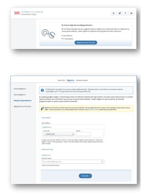 Eğer daha önce iletişim bilgilerinizi doğrulamadı iseniz, yandaki gibi bir ekran ile karşılaşacaksınız. “Bilgilerimi Şimdi Güncelle” düğmesine basarak e-posta ve cep telefonu bilgilerinizi sisteme giriniz. Ekrandaki yönergeleri takip ederek her ikisini de doğrulanmış hale getiriniz.
