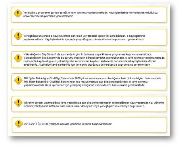 Elektronik kayda, özel yetenek programları ile yükseköğretim kurumlarınca elektronik kaydı uygun görülmeyen programlar (sağlık raporu isteyen programlar gibi) dâhil edilmeyecektir. Sağlık raporu vb. istenen programlara yerleşen öğrencilerin açıklanan tarihler arasında istenen belgeler ile birlikte ilgili yükseköğretim kurumlarına başvurmaları gerekmektedir.