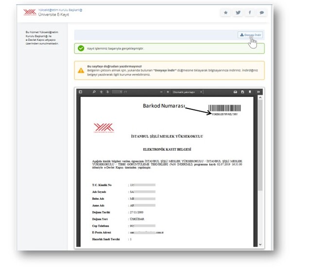 İpucu: Eğer belgenizi yazdırma imkanınız yok ise barkod numarasını ve T.C. Kimlik Numaranızı, belgeyi vereceğiniz kuruma iletmeniz yeterlidir. Barkod numaranızı ve T.C. Kimlik Numaranızı ilettiğiniz kişiler “Üniversite E-Kayıt Belge Doğrulama” hizmetini kullanarak, belgenin bir kopyasını alabilir ve geçerliliğini kontrol edebilirler.