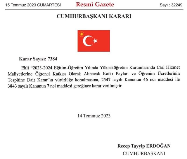 Üniversite harçlarıyla ilgili alınan 7384 sayılı Cumhurbaşkanlığı kararnamesi Resmi Gazete'de yayınlanarak yürürlüğe girdi.