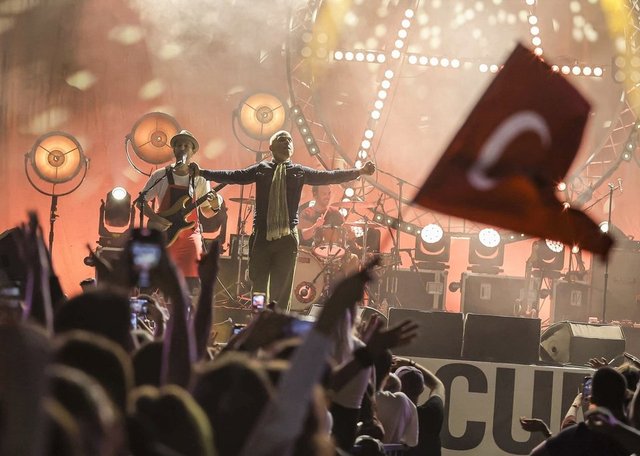 Meydanı dolduran 15 bin kişiye 90’ların parçalarıyla bayram coşkusu yaşatan şarkıcılar, konserlerinin finalini “10. Yıl Marşı” ve “İzmir Marşı” ile yaptı.