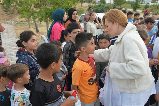 Türkoğlu ilçesindeki Şekeroba Geçici Konaklama Merkezi'nde barınan depremzedeleri ziyaret eden ünlüler, Tuzla Belediyesi tarafından hazırlanan çeşitli hediyeleri dağıtıp, çocuklarla oyunlar oynadı.