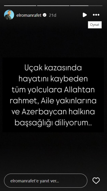 Rafet El Roman: Uçak kazasında hayatını kaybeden tüm yolculara Allah'tan rahmet, ailelerine ve Azerbaycan halkına başsağlığı diliyorum.