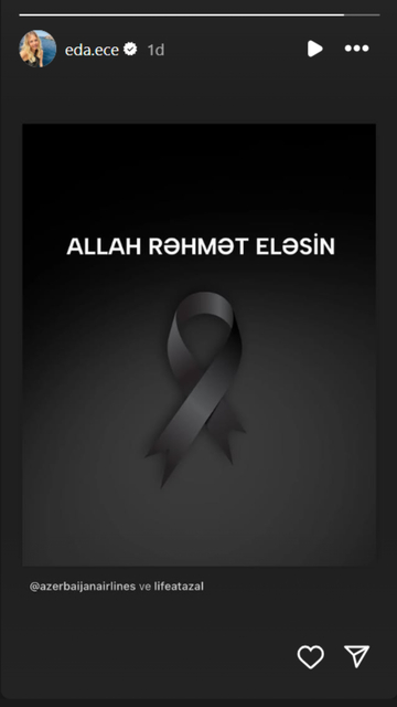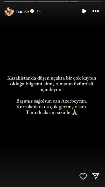 Hadise: Kazakistan'da düşen uçakta birçok kaybın olduğu bilgisini almış olmanın üzüntüsü içindeyim. Başımız sağ olsun can Azerbaycan. Kurtulanlarada çok geçmiş olsun. Tüm dualarım sizinle.