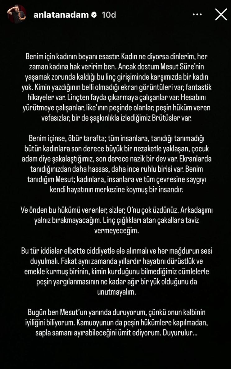 'Anlatanadam' sahne adlı komedyen İbrahim Türker, arkadaşı Mesut Süre'ye destek verip yaptığı açıklamada şu ifadelere yer verdi; "Benim için kadının beyanı esastır. Kadın ne diyorsa dinlerim, ben her zaman kadına hak veririm. Ancak dostum Mesut Süre'nin yaşamak zorunda kaldığı bu linç girişiminde karşımızda bir kadın yok. Kimin yazdığının belli olmadığı ekran görüntüleri var, fantastik hikâyeler var. Linçten fayda çıkarmaya çalışanlar var. Hesabını yürütmeye çalışanlar, like'ının peşinde olanlar, peşin hüküm veren vefasızlar, bir de şaşkınlıkla izlediğimiz Brütüsler var. Benim içinse, öbür tarafta; tüm insanlara, tanıdığı tanımadığı bütün kadınlara son derece büyük bir nezaketle yaklaşan, 'Çocuk adam' diye şakalaştığımız, son derece nazik bir dev var. Ekranlarda tanıdığınızdan daha hassas, daha ince ruhlu birisi var. Benim tanıdığım Mesut; kadınlara, insanlara ve tüm çevresine saygıyı kendi hayatının merkezine koymuş bir insandır. Ve önden bu hükmü verenler, sizler, Onu çok üzdünüz. Arkadaşımı yalnız bırakmayacağım. Linç çığlıkları atan çakallara taviz vermeyeceğim. Bu tür iddialar elbette ciddiyetle ele alınmalı ve her mağdurun sesi duyulmalı. Fakat aynı zamanda yıllardır hayatını dürüstlük ve emekle kurmuş birinin, kimin kurduğunu bilmediğimiz cümlelerle peşin yargılanmasının ne kadar ağır bir yük olduğunu da unutmayalım. Bugün ben Mesut'un yanında duruyorum. Çünkü onun kalbinin iyiliğini biliyorum. Kamuoyunun da peşin hükümlere kapılmadan, sapla samanı ayırabileceğini ümit ediyorum. Duyurulur..."