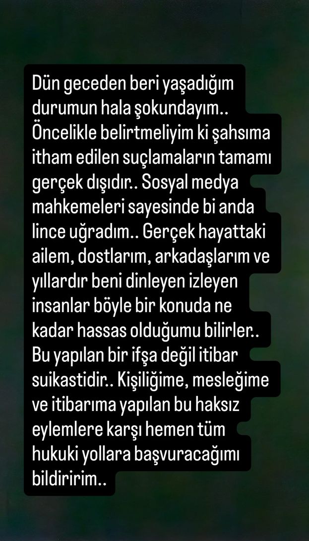 Ünlü komedyen, şu ifadeleri kullandı: Dün geceden beri yaşadığım durumun hâlâ şokundayım. Öncelikle belirtmeliyim ki; şahsıma itham edilen suçlamaların tamamı gerçek dışıdır. Sosyal medya mahkemeleri sayesinde bir anda lince uğradım. Gerçek hayattaki ailem, dostlarım, arkadaşlarım ve yıllardır beni dinleyen izleyen insanlar böyle bir konuda ne kadar hassas olduğumu bilirler. Bu yapılan bir ifşa değil itibar suikastıdır. Kişiliğime, mesleğime ve itibarıma yapılan bu haksız eylemlere karşı hemen tüm hukuki yollara başvuracağımı bildiririm.