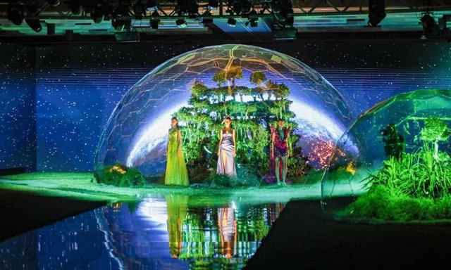 Yeryüzü kaynaklarının doğru kullanımına dikkati çekmek amacı taşıyan podyum tasarımında, dünyanın kurak ve çölleşmiş görünümü altında kurtarılabilmiş bitkiler fanuslar içinde sergilendi.