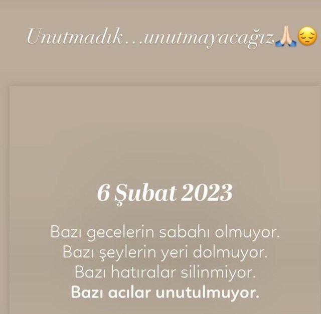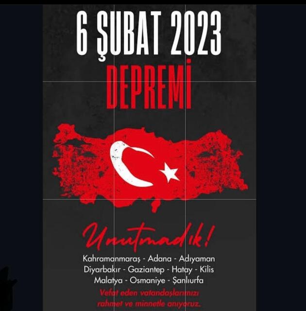 6 Şubat 2023 tarihindeki depremde kaybettiklerimizi unutmadık. Onlara Allah'tan rahmet, yakınlarına da sabırlar diliyorum. Dilerim bu acılar bir daha yaşanmasın.
