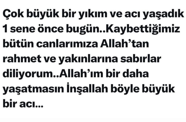 Çok büyük bir yıkım ve acıyaşadık bir sene önce bugün... Kaybettiğimiz bütün canlarımıza Allah'tan rahmet, yakınlarına sabırlar diliyorum. Allah'ım bir daha yaşatmasın inşallah böyle büyük bir acı....