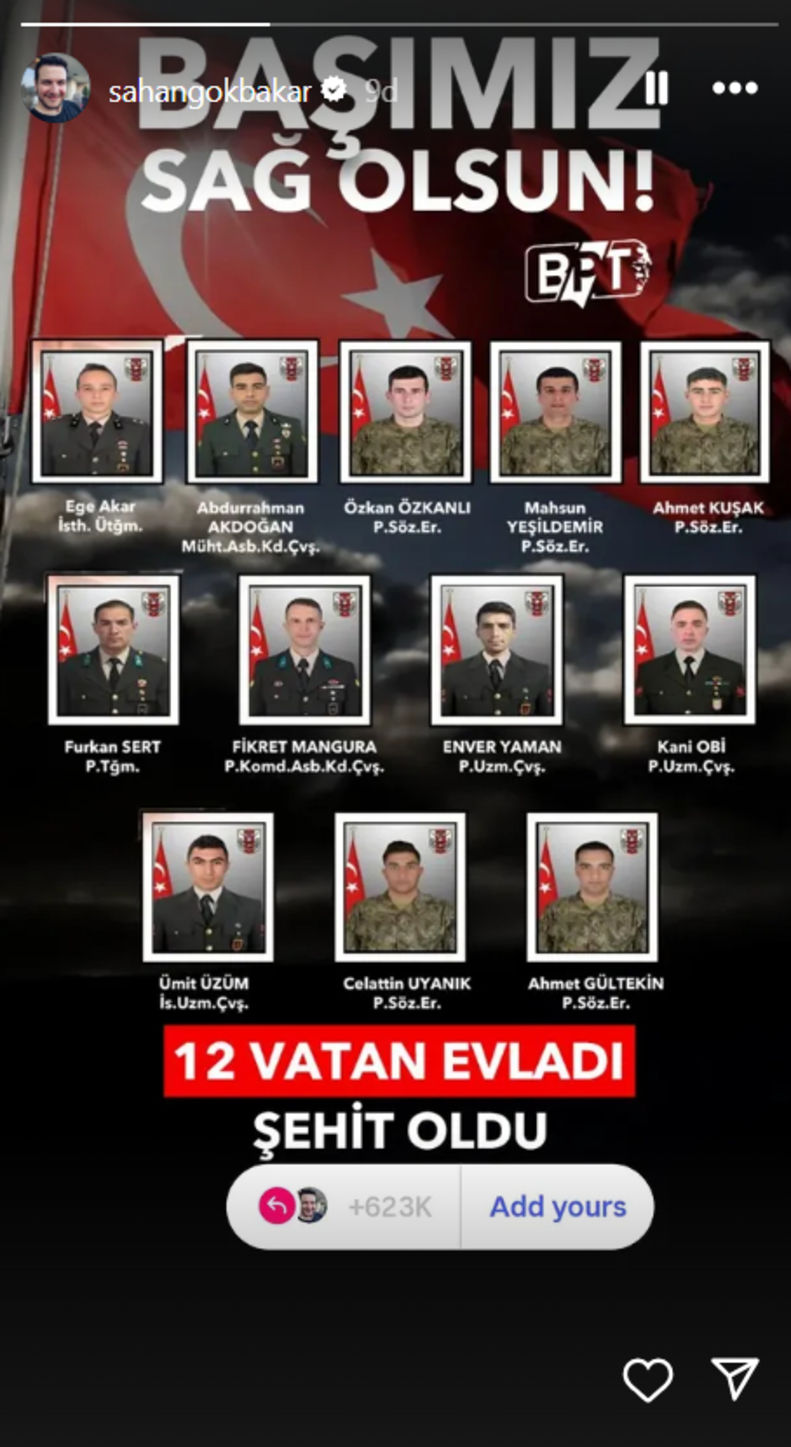 Berk Oktay: Pençe-Kilit bölgesinde bir mağarada arama tarama faaliyetinde metan gazına maruza kalan 19 Askerimizden 12'si şehit oldu. Türk milletinin başı sağ olsun.