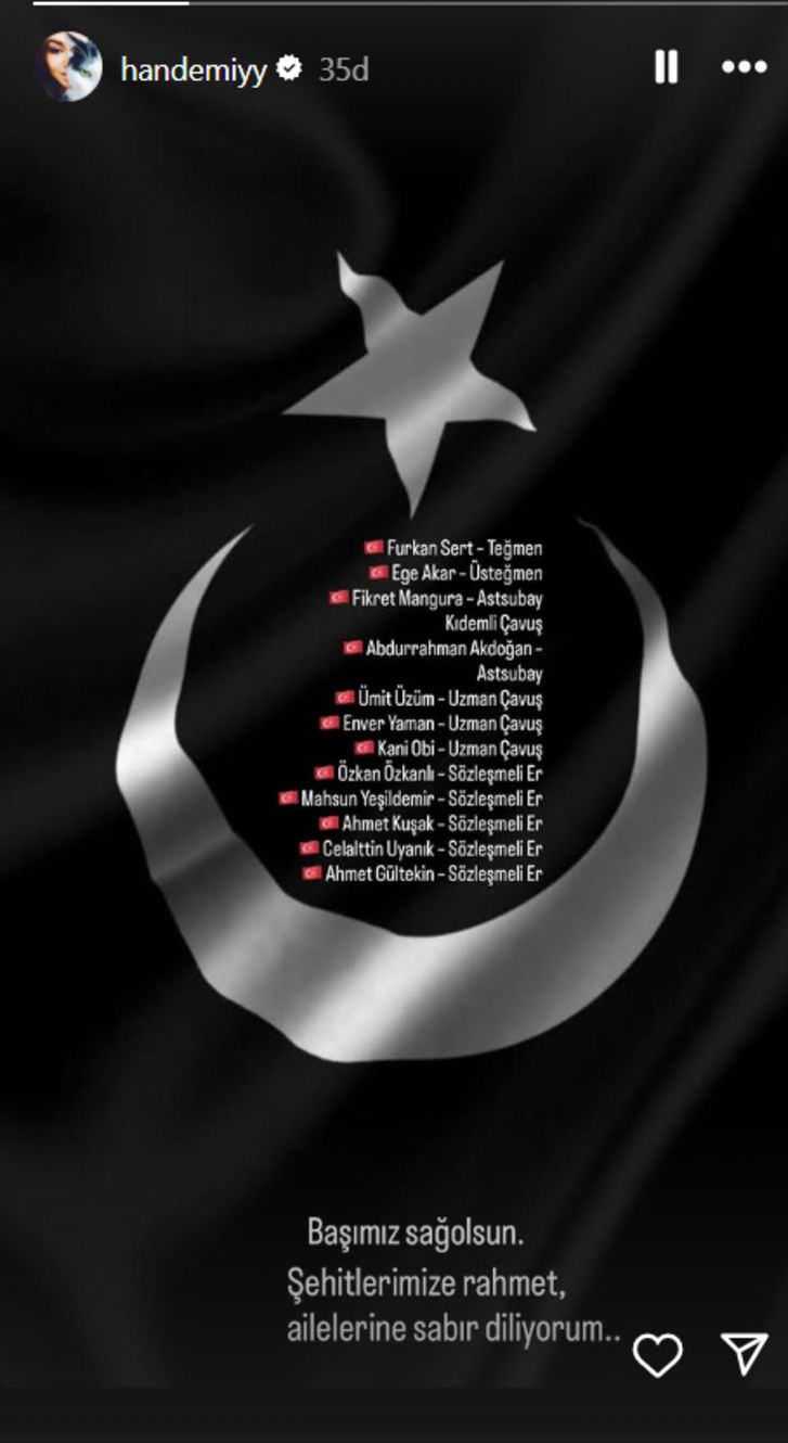 Hande Erçel: "Başımız sağ olsun. Şehitlerimize rahmet, ailelerine sabır diliyorum."