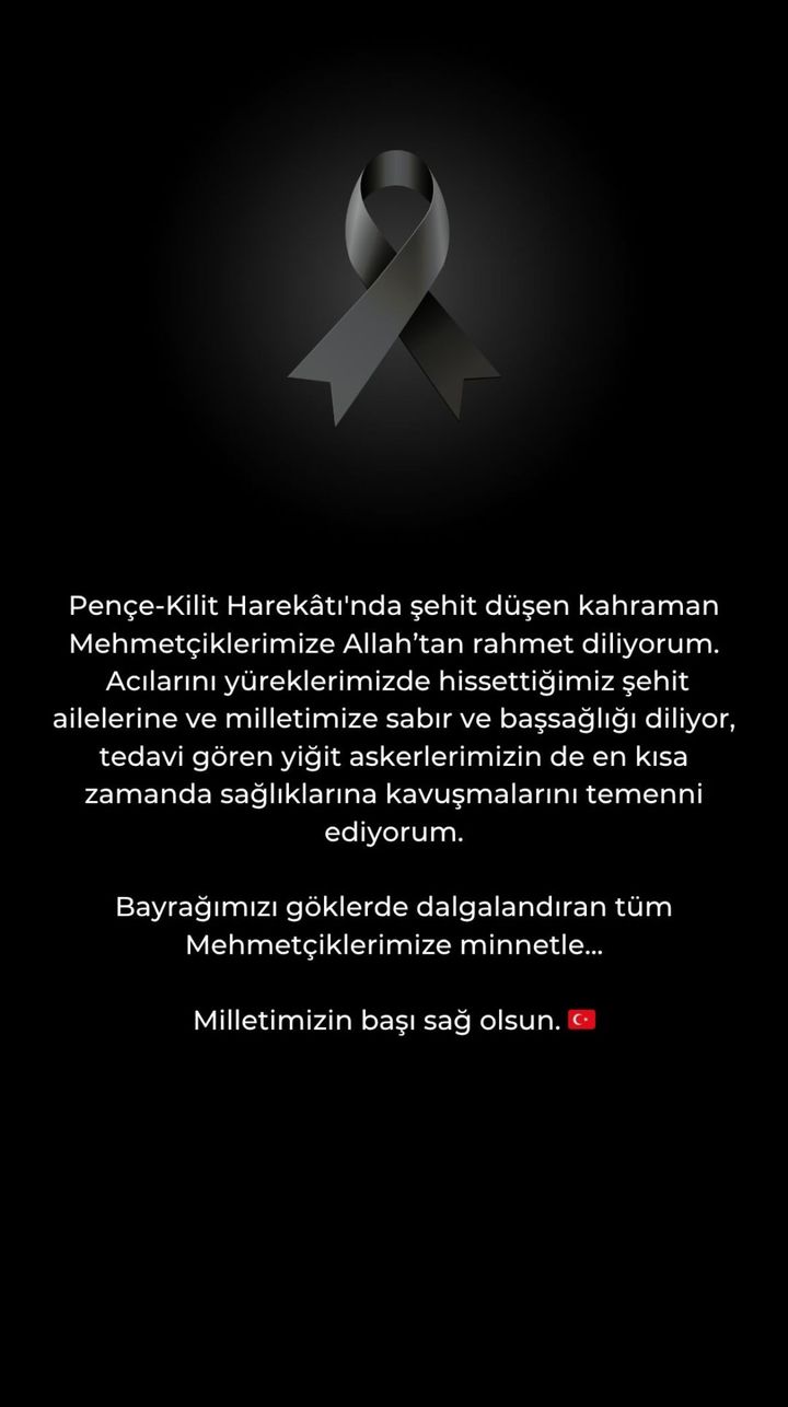 Kenan Doğulu: Pençe - Kilit Harekâtı'nda şehit düşen kahraman Mehmetçiklerimize Allah'tan rahmet diliyorum. Acılarını yüreklerimizde hissettiğimiz şehit ailelerine ve milletimize sabır ve başsağlığı diliyor, tedavi gören yiğit askerlerimizin de en kısa zamanda sağlıklarına kavuşmalarını temenni ediyorum. Bayrağımızı göklerde dalgalandıran tüm Mehmetçiklerimize minnetle... Milletimizin başı sağ olsun.