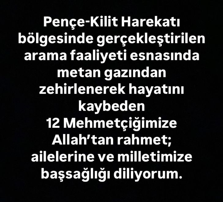 Pençe - Kilit Harekât bölgesinde bulunan, teröristlerden temizlenmiş olan 852 rakımlı tepedeki bir mağarada arama - tarama faaliyeti sırasında 19 askerimiz, metan gazından zehirlendi. 12 askerimiz, şehit düştü. Ünlüler, başsağlığı mesajlarıyla üzüntülerini dile getirdi