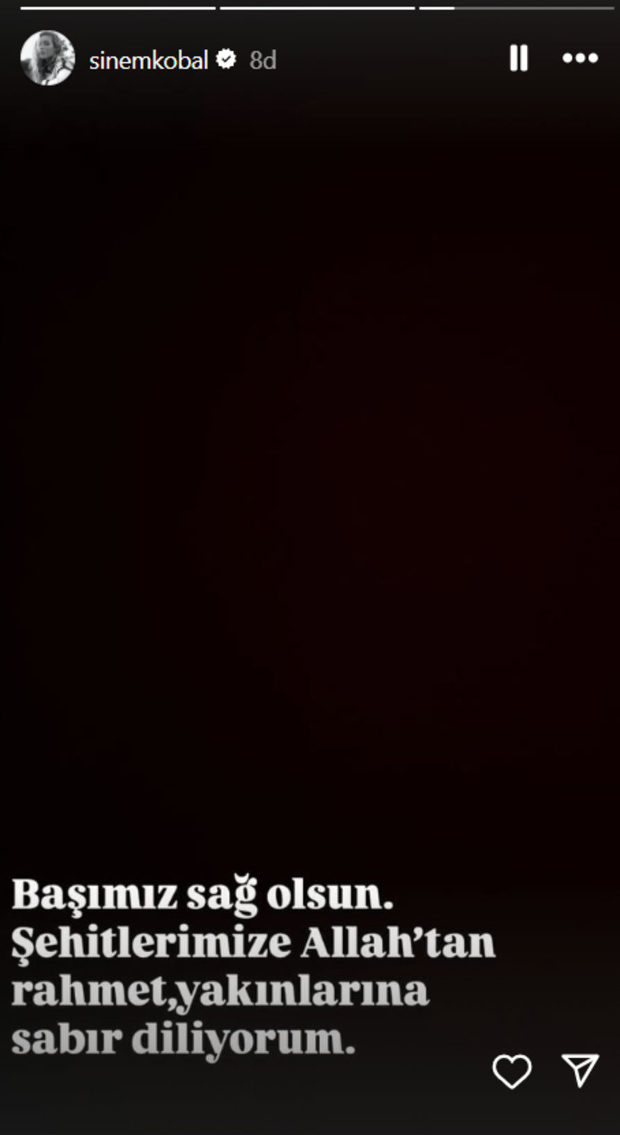 Sinem Kobal: "Başımız sağ olsun. Şehitlerimize Allah'tan rahmet, yakınlarına sabır diliyorum."