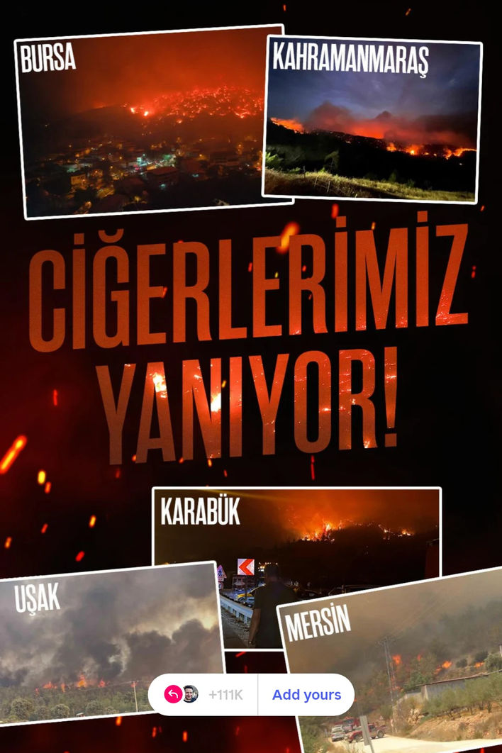 Hülya Koçyiğit: Ülkemin dört bir yanı, ciğerleri yanıyor. Kuzeyden güneye, doğudan batıya her yer alev alev. Gökten küller yağıyor, toprak acı kokuyor. Alevler sadece ağaçları değil, içimizi, geleceğimizi, vicdanımızı da yakıyor. Her ağaçla birlikte bir yaşam sönüyor; kaçıncı yangın, kaçıncı orman, kaçıncı kayıp bu? Sadece ormanlar değil, biz de tutuşuyoruz... İnsan olan herkesin yüreği yanıp kavruluyor. Dualarım; alevlerin ortasında görev yapan kahramanlarla, evlerini boşaltmak zorunda kalan insanlarla ve hâlâ bu ülkenin doğasına, toprağına, ağacına sahip çıkan yüreklerle. Bu yangınlar sönmeden içimiz sönmeyecek. Geçmiş olsun ülkem...