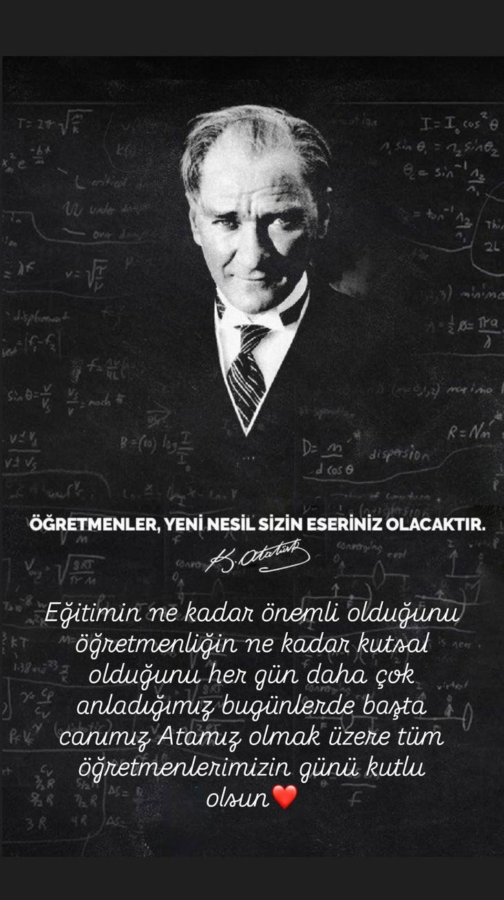 Özge Ulusoy: "Öğretmenler, yeni nesil sizin eseriniz olacaktır" Mustafa Kemal Atatürk... Eğitimin ne kadar önemli olduğunu öğretmenliğin ne kadar kutsal olduğunu her gün daha çok anladığımız bugünlerde başta canımız Atamız olmak üzere tüm öğretmenlerimizin günü kutlu olsun.