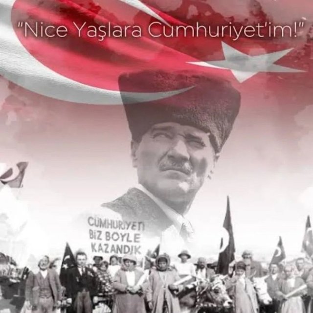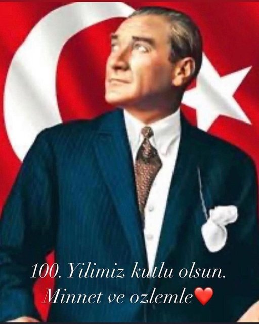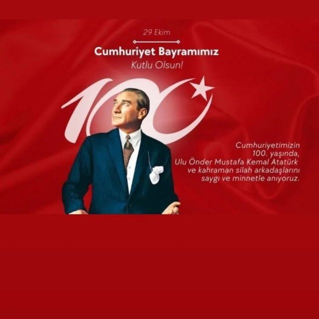 Mustafa Kemal Atatürk'ün Ata'mızın cesur ve güçlü bir liderin önderliğinde kurulan Cumhuriyetimizin 100'üncü yılı... Bugün, yarın ve hatta yüzyıllar sonra Cumhuriyetimizin izinde, O'nun sönmeyen ışığında... Cumhuriyetimizin 100'üncü yılı kutlu olsun! Ne mutlu Türk'üm diyene.