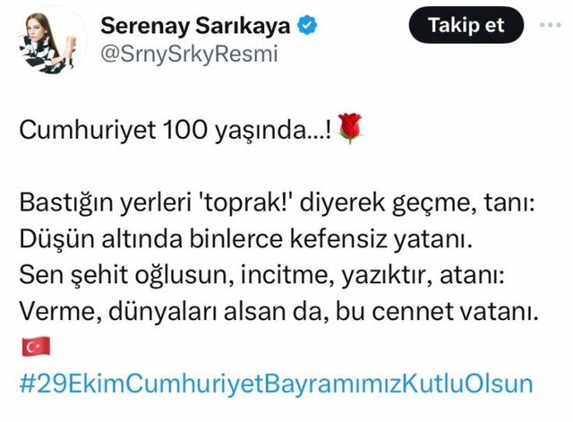 Cumhuriyetimizin 100'üncü yılını böyle gururla, coşkuyla kutlarken Ata'mızın en büyük armağanı için başta kendisi ve tüm bu uğurda emek vermiş olanlara teşekkür ediyor ve bugün bu özgür vatanda nefes alıyorsam onları bunun bedelini ödedikleri için sevgiyle, saygıyla, minnetle anıyorum...
