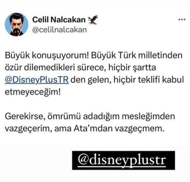 Büyük konuşuyorum! Büyük Türk milletinden özür dilemedikleri sürece, hiçbir şartta DisneY PlusTR'den gelen, hiçbir teklifi kabul etmeyeceğim! Gerekirse, ömrümü adadığım mesleğimden vazgeçerim, ama Ata’mdan vazgeçmem.