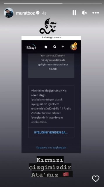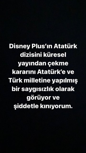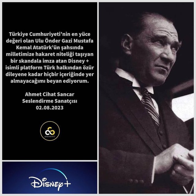 Türkiye Cumhuriyeti'nin en yüce değeri olan Ulu Önder Gazi Mustafa Kemal Atatürk'ün şahsına, milletimize hakaret niteliği talıyan bir skandala imza atan Disney isimli platform Türk halkından özür dileyene kadar hiçbir içeriğinde yer almayacağımı beyan ediyorum.