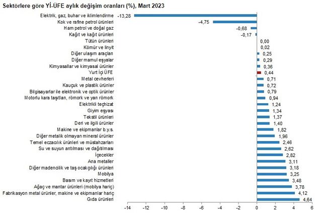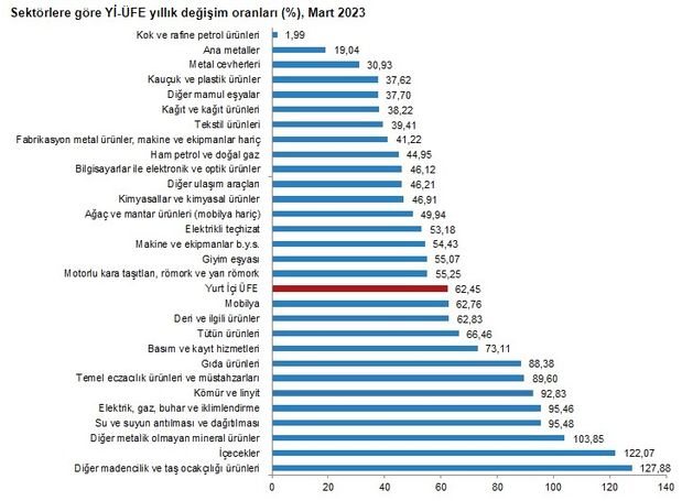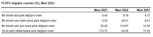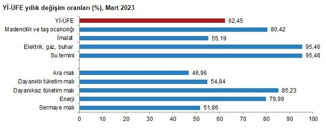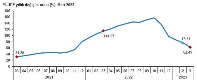 Türkiye İstatistik Kurumu'nun (TÜİK) açıkladığı verilere göre; Yİ-ÜFE (2003=100) 2023 yılı Mart ayında bir önceki aya göre yüzde 0,44, bir önceki yılın aralık ayına göre yüzde 6,25, bir önceki yılın aynı ayına göre yüzde 62,45 ve on iki aylık ortalamalara göre yüzde 113,73 artış gösterdi