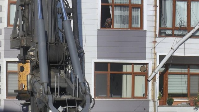 Üsküdar'da metro şantiyesinde demirleri taşıyan vinçteki zincirin kopması sonucu, demirler şantiyenin yanındaki binaya çarptı.