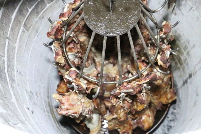 Kayaalp, genellikle kahvaltıda tüketilen büryanın hazırlığına gece saat 02.00 sıralarında başladıklarını belirterek, etin kemikli olan kaburga ve omurga kısımlarını pişirilmek üzere bakır kazana koyduklarını, gövdedeki kemiksiz etleri de çengellere astıklarını aktardı.