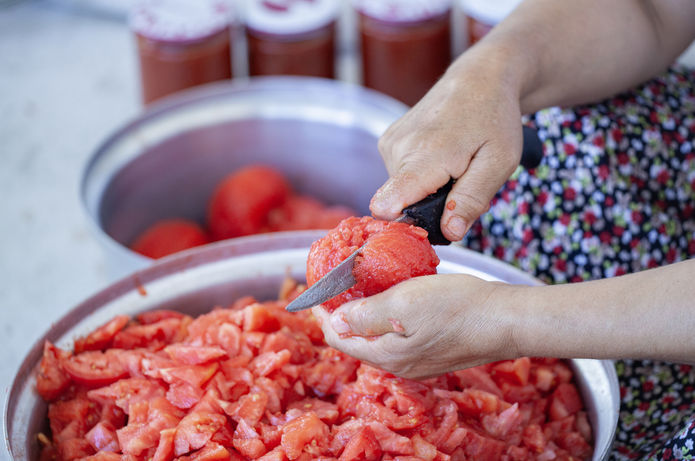 Domates konservelerini hazırlamadan önce ilk adım, domateslerin kabuklarını soymaktır. Bunun için iki farklı yöntem kullanılabilir. İsterseniz domatesleri patates soyar gibi tek tek soyabilirsiniz. Ancak çok daha pratik bir yöntem olan kaynar suya atma tekniği ile bu işlemi kısa sürede tamamlamak mümkündür.