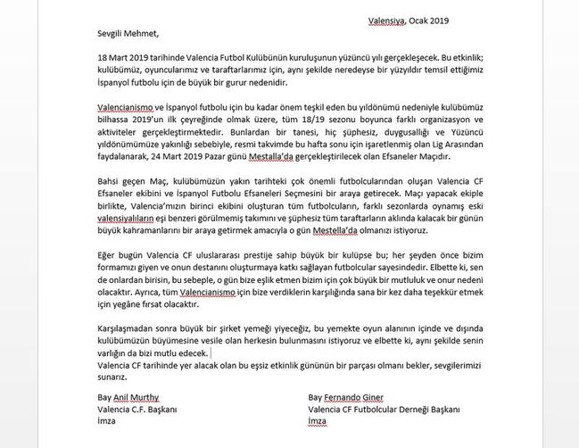 24 Mart'taki Valencia CF Efsaneler ekibini ve İspanyol Futbolu Efsaneleri seçmesini bir araya getirecek özel ve anlamlı gösteri maçı için Mehmet Topal'a gelen mektup şöyle: