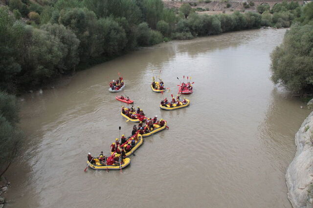 Erzincan Valisi Hamza Aydoğdu ile gazilerin Karasu Nehri'nde rafting yaptığı etkinlikte, su üstünde 50 metre uzunluğunda Türk bayrağı açıldı. 8 kilometrelik parkurda yaklaşık iki buçuk saat süren raftinge katılan 8 gazi, unutulmaz bir gün yaşadı