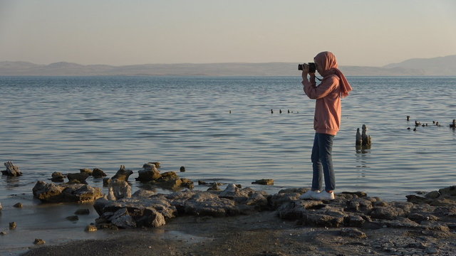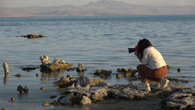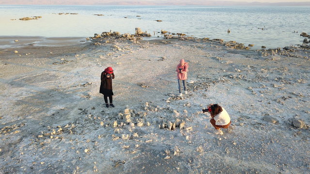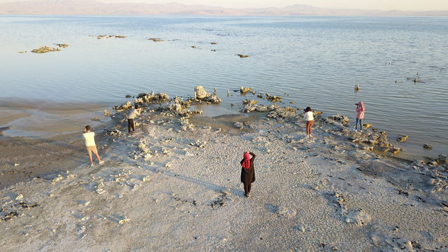 Erciş ilçesinin Gölağzı mevkisinde doğa tutkunları ve fotoğrafseverler, ortaya çıkan mikrobiyalitleri fotoğrafladı.