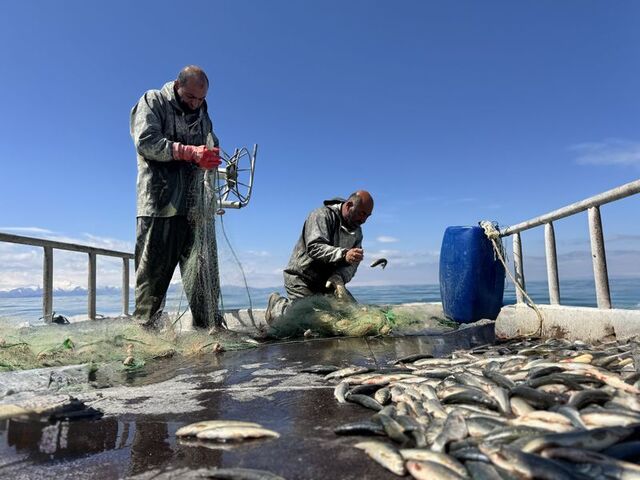Soğuk havaya rağmen göle açılarak son ağlarını göle bırakan balıkçılar, 15 Nisan'da yasağın başlamasıyla sezonu kapatmaya hazırlanıyor.