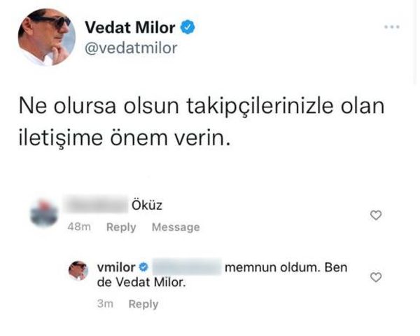 Sosyal medya hesabını aktif kullanan ünlü gurme Vedat Milor, kendisine gelen yorumlara kayıtsız kalmıyor. Milor, "Ne olursa olsun takipçilerinizle olan iletişime önem verin" diyerek, bir takipçisi ile yazışmasını paylaştı