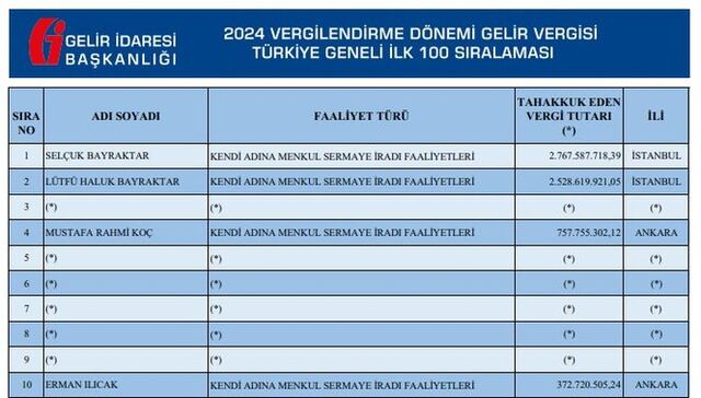 Selçuk Bayraktar, 2024 yılı vergilendirme dönemine ilişkin 2 milyar 767 milyon 587 bin lira, Haluk Bayraktar da 2 milyar 528 milyon 619 bin lira gelir vergisi ödeyerek ilk iki sırada yer aldı.