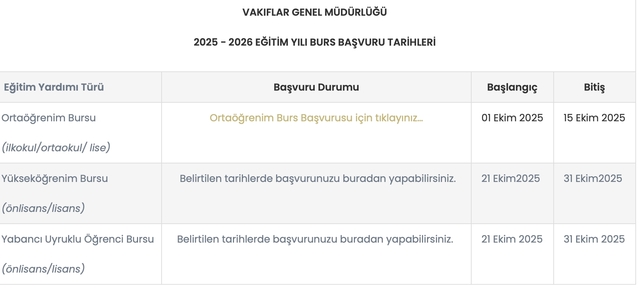 Öğrencilerin en çok araştırdığı konuların başında Vakıflar Genel Müdürlüğü bursu geliyor. Hem yeni eğitim-öğretim yılının başlaması hem de üniversite ek tercih sonuçlarının açıklanmasıyla birlikte, VGM burs başvurularının ne zaman başlayacağı merak ediliyor. İşte, VGM burs başvuru tarihi, şartları