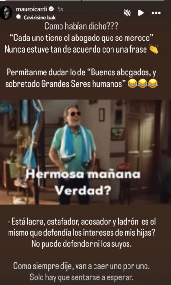 Mauro Icardi paylaşımında şu ifadeleri kullandı; "Nasıl demişlerdi? 'Herkes hak ettiği avukata sahiptir.' Bu cümleyle hiç bu kadar hemfikir olmamıştım. İyi avukatlar ve her şeyden önce 'Büyük İnsanlar' kısmına gelince, buna da şüpheyle yaklaşmama izin verin. Bu ahlaksız, dolandırıcı, sapık ve hırsız, kızlarımın çıkarlarını savunan aynı kişi miydi? Kendi çıkarlarını bile savunamıyor. Her zaman söylediğim gibi, birer birer düşecekler. Sadece oturup beklemek gerekiyor."