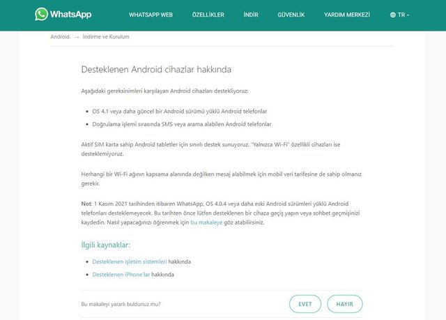 Whatsapp, Android işletim sistemi için 4.1, iOS işletim sistemi için iOS 10 altındaki güncellemelerde uygulamanın desteklenmeyeceğini duyurdu. Eğer kullanılan akılloı telefonlarda bu güncellemeler yapıldıysa Whatsapp çalışmaya devam edecek ama bu güncellemelerin yapılmadığı telefonlarda destek kesilecek.