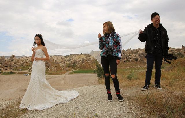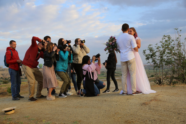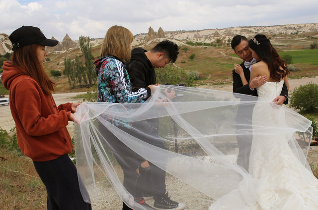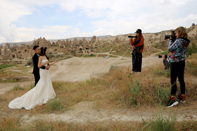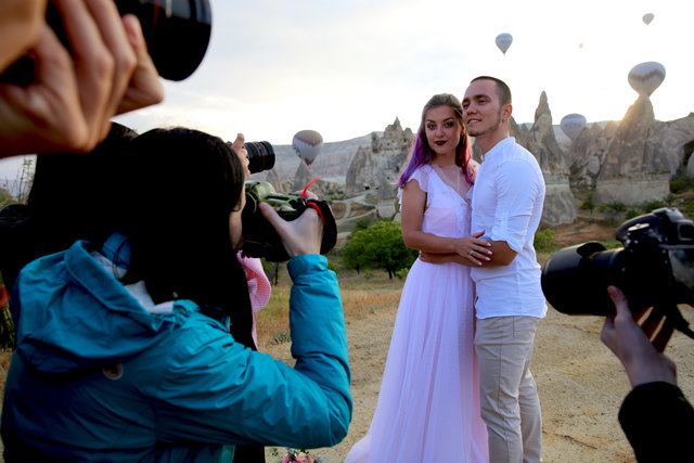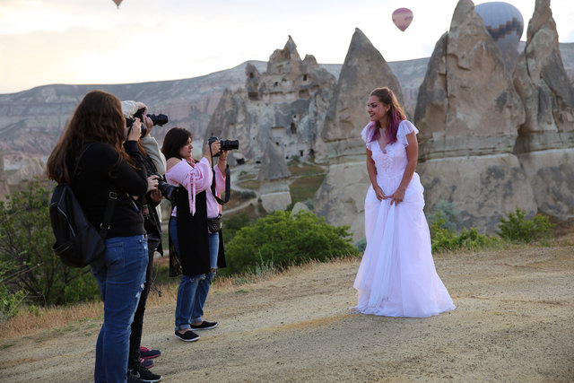 Doğal güzellikleriyle konuklarına masalsı bir manzara sunan Kapadokya, düğün fotoğrafı çektirmek isteyen yabancı çiftlerin gözde mekanı haline geldi. Çeşitli ülkelerden gelen gelin ve damatlar, sıcak hava balonlarıyla renklenen bölgede peribacaları arasında objektif karşısına geçiyor