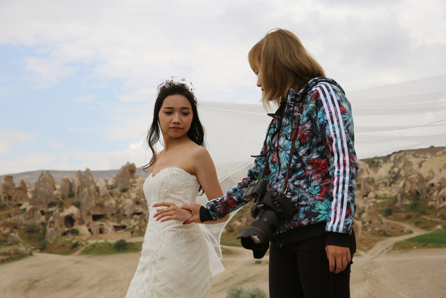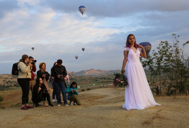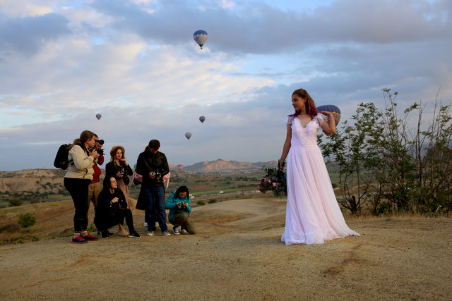 Bir ömür saklayacakları fotoğraflar için Kapadokya'yı tercih eden başta Çin ve Rusya olmak üzere çeşitli ülkelerden gelen gelin ve damatlar, sabahın erken saatlerinden itibaren farklı mekanları gezerek, en iyi fotoğraf karelerini yakalayabilmek için çaba sarf ediyor.