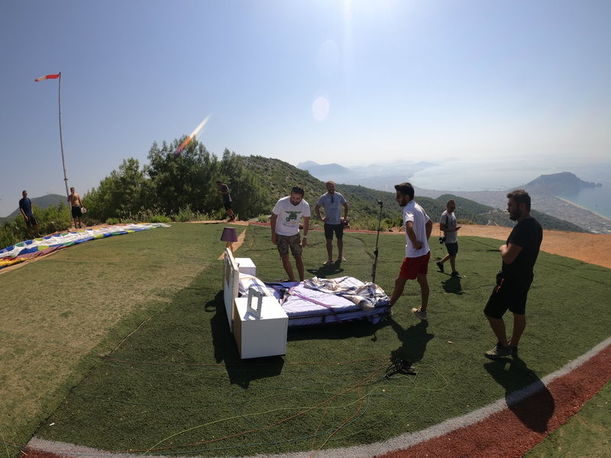 Kaval, Alanya Turizm Tanıtma Vakfı ve Ulusky yamaç paraşütü pilotlarının desteğiyle paraşütüne bağladığı yatakla yaklaşık 800 metre yükseklikteki Yassıtepe'den atlayış yaptı.