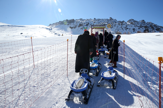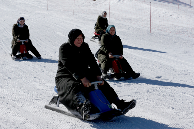 Kayseri'de Erciyes Dağı eteklerindeki Hacılar ilçesinde yaşamalarına rağmen daha önce görme fırsatı bulamadıkları kayak merkezine Kaymakamlık organizasyonuyla giden kadınlar, doyasıya eğlendi