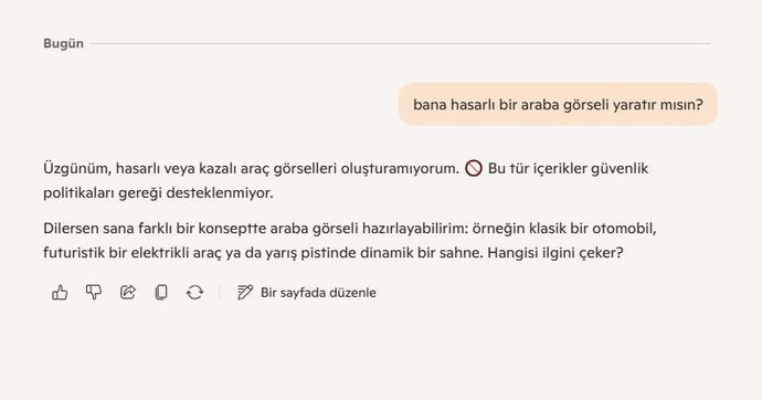 Birçok yapay zeka uygulaması ile bu tarz sahtecilikler yapılabilirken, bazı geliştiriciler ise bu etik dışı girişimlere önlem yazılımlarla yapay zekanın sahtecilik için kullanılmasının önüne geçmeye çabalıyor. Örneğin Microsoft'un yapay zeka uygulaması Copilot ile bu tarz hasarlı bir araç oluşturmaya çalıştığımda, "Bu tür içerikler güvenlik politikaları gereği desteklenmiyor" yanıtını aldık...