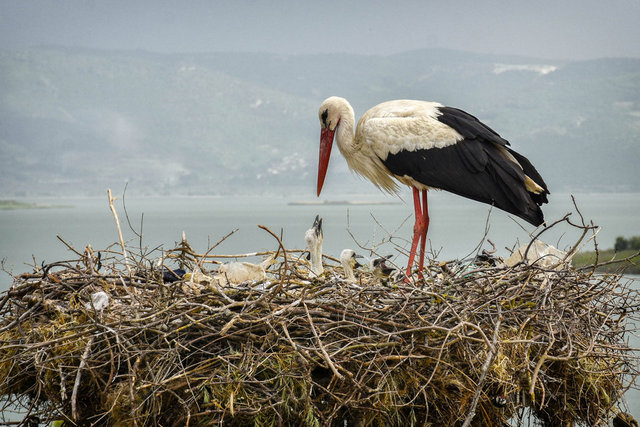 Doğa ve yaban hayatı fotoğrafçısı Alper Tüydeş, Uluabat Gölü manzaralı yuvalarında Yaren, eşi Nazlı ve yavrularının görüntülerini kaydetti.