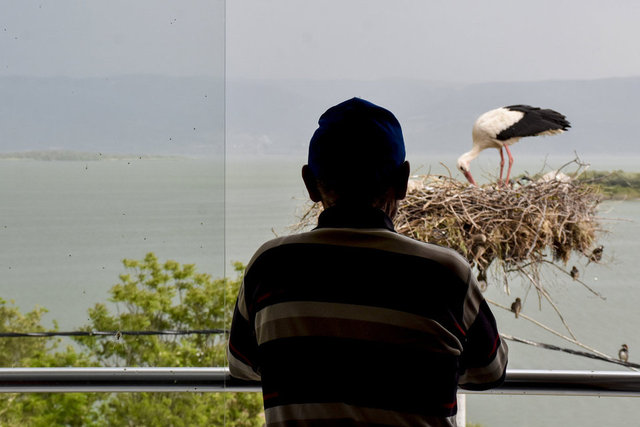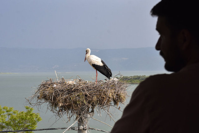 Bursa'nın Karacabey ilçesi Eskikaraağaç Mahallesi'nde, balıkçı Adem Yılmaz ile 12 yıllık dostluklarıyla tanınan Yaren leylek, göl manzaralı yeni yuvasında yavrularıyla görüntülendi