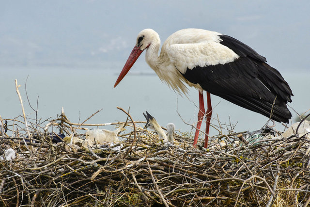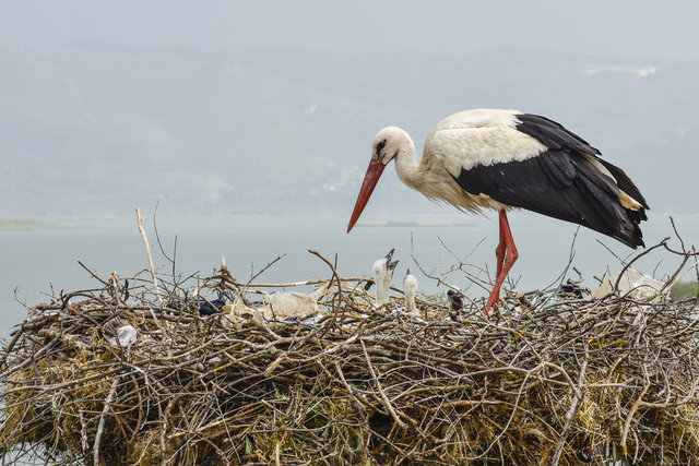 Yavruları, yağmurdan ve güneşten koruyan leylek ailesi, dönüşümlü olarak avlanmaya çıkıp topladıkları besinleri yuvalarına taşıyor.