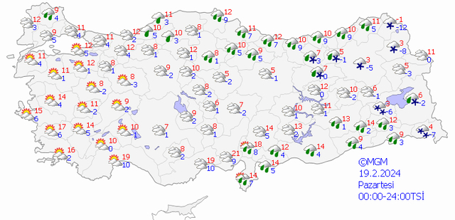 Meteoroloji'nin 19 Şubat Pazartesi gününe dair yayımladığı hava durumu raporuna göre; Yurdun kuzeyi ile doğusunda yağış beklenirken diğer bölgeler daha sakin bir gün geçirecek. Ardahan'da bugün kar yağışı beklenirken termometrelerin -12'ye kadar düşeceği tahmin ediliyor. Öte yandan Antalya ise güç içinde 19 dereceye çıkacak hava sıcaklığı ile adeta bahardan kalma bir gün yaşayacak.