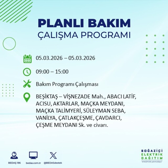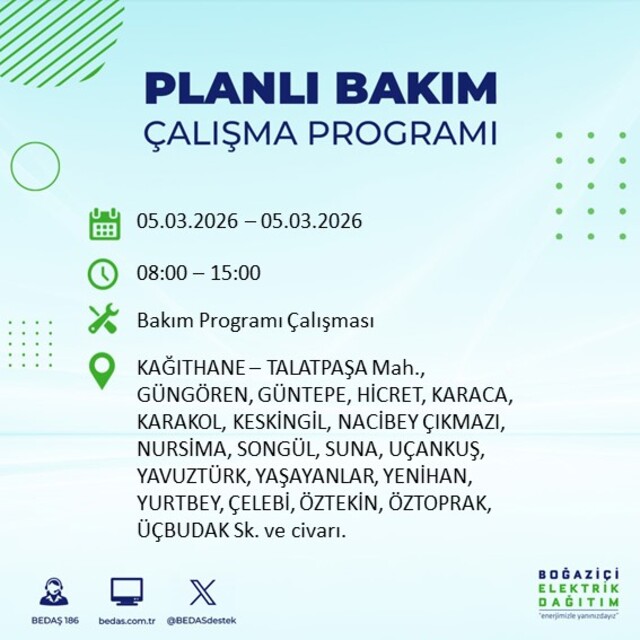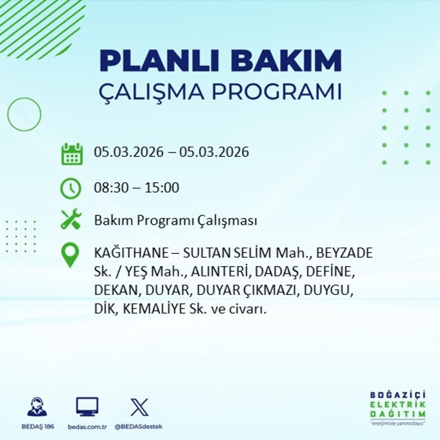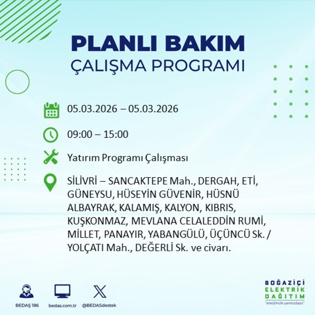 BEDAŞ, 5 Mart’ta İstanbul genelinde planlı bakım ve onarım çalışmaları kapsamında bazı ilçelerde elektrik kesintisi uygulanacağını duyurdu. Yapılan açıklamaya göre; Zeytinburnu, Şişli, Sultangazi, Silivri, Sarıyer, Küçükçekmece, Kağıthane, Güngören, Gaziosmanpaşa, Fatih, Eyüpsultan, Esenyurt, Çatalca, Büyükçekmece, Beyoğlu, Beylikdüzü, Beşiktaş, Başakşehir, Bakırköy, Bahçelievler, Bağcılar ve Avcılar’da belirli saat aralıklarında elektrik kesintileri yaşanacak. İşte, 5 Mart 2026 İstanbul planlı elektrik kesintisi programı ve etkilenecek mahalleler.